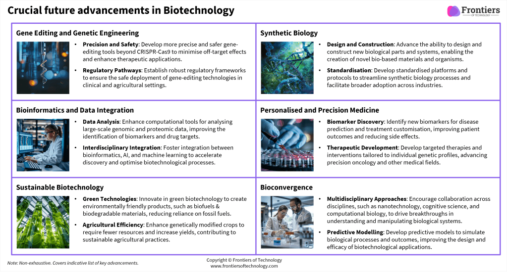 Multiple advancements will be crucial for pushing the biotechnology industry forward, addressing global challenges, and unlocking new opportunities across healthcare, agriculture, and environmental sectors.